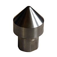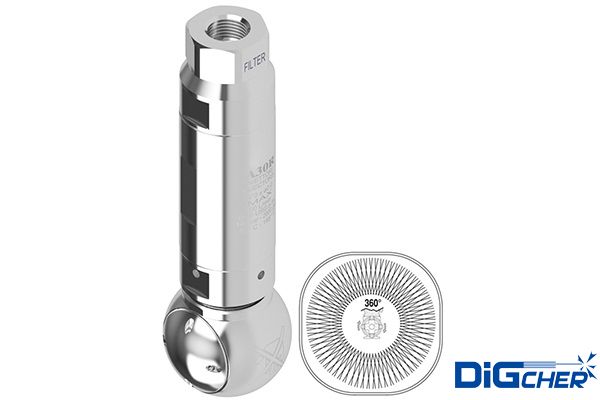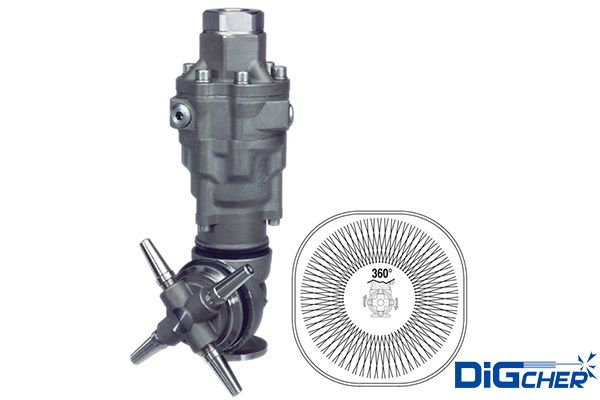 三維自動旋轉噴頭主要由不銹鋼制成,可以有效抵抗噴嘴旋轉產(chǎn)生的強大沖擊力。由一對錐齒輪、旋轉密封組件及液壓調速裝置等主要部件構成。進行清洗作業(yè)時,由于兩個噴管沿軸線方向具有偏心,依靠高壓水射流的反沖力使小齒輪繞著水平軸線旋轉,在經(jīng)過大齒輪的嚙合作用下使旋轉密封部件沿豎直軸線旋轉。這樣就實現(xiàn)了三維旋轉清洗作業(yè)。