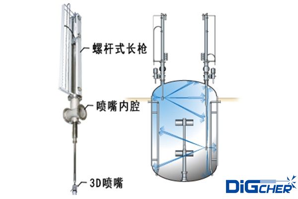 德高潔全自動不銹鋼反應(yīng)釜清洗系統(tǒng)具體清洗流程是將三維旋轉(zhuǎn)噴頭伸縮機構(gòu)安裝在反應(yīng)釜入孔上,伸縮桿伸進反應(yīng)釜內(nèi),伸縮機構(gòu)可采用手動、電動、液壓等控制,伸縮桿在反應(yīng)釜內(nèi)伸縮和沿反應(yīng)釜內(nèi)壁周圍方向移動。根據(jù)具體實際情況可選用2孔或4孔三維自動旋轉(zhuǎn)噴頭,當(dāng)三維自動旋轉(zhuǎn)噴頭水平旋轉(zhuǎn)時,水射流形成的旋轉(zhuǎn)力矩帶動噴嘴在垂直面內(nèi)旋轉(zhuǎn)。由于三維旋轉(zhuǎn)噴頭與伸縮桿的復(fù)合運動,高壓水射流可以覆蓋反應(yīng)釜內(nèi)任何位置,從而完成反應(yīng)釜的清洗。